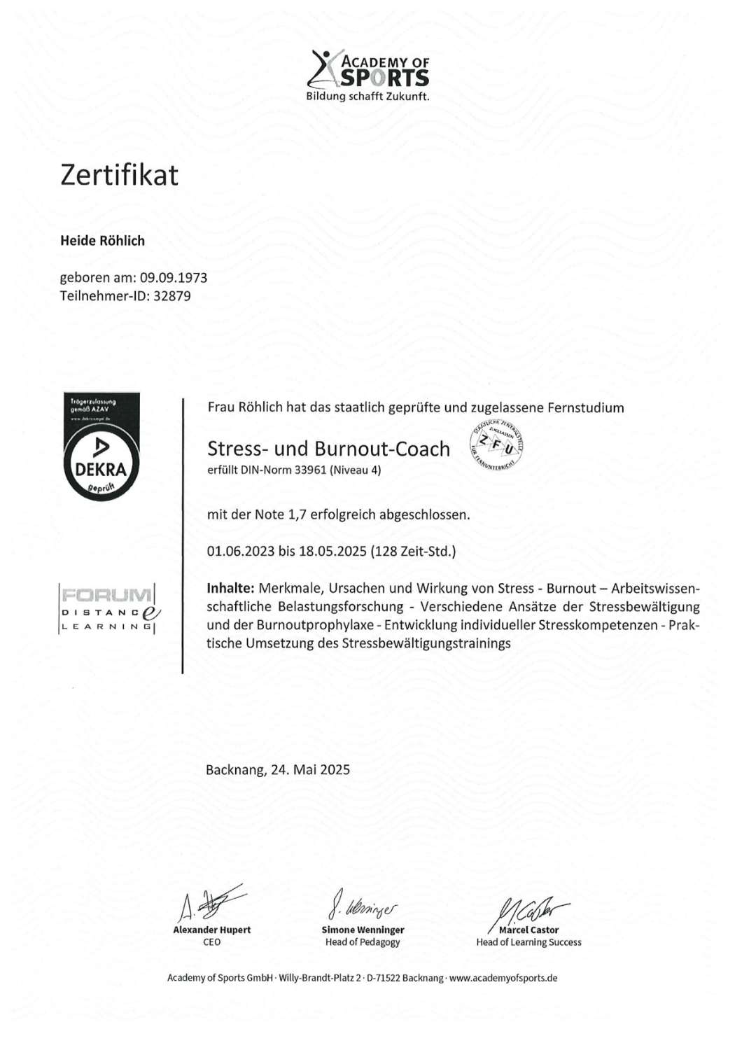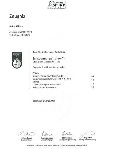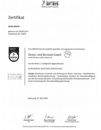 - Stress- und Burnout Trainer (Academy of Sports)